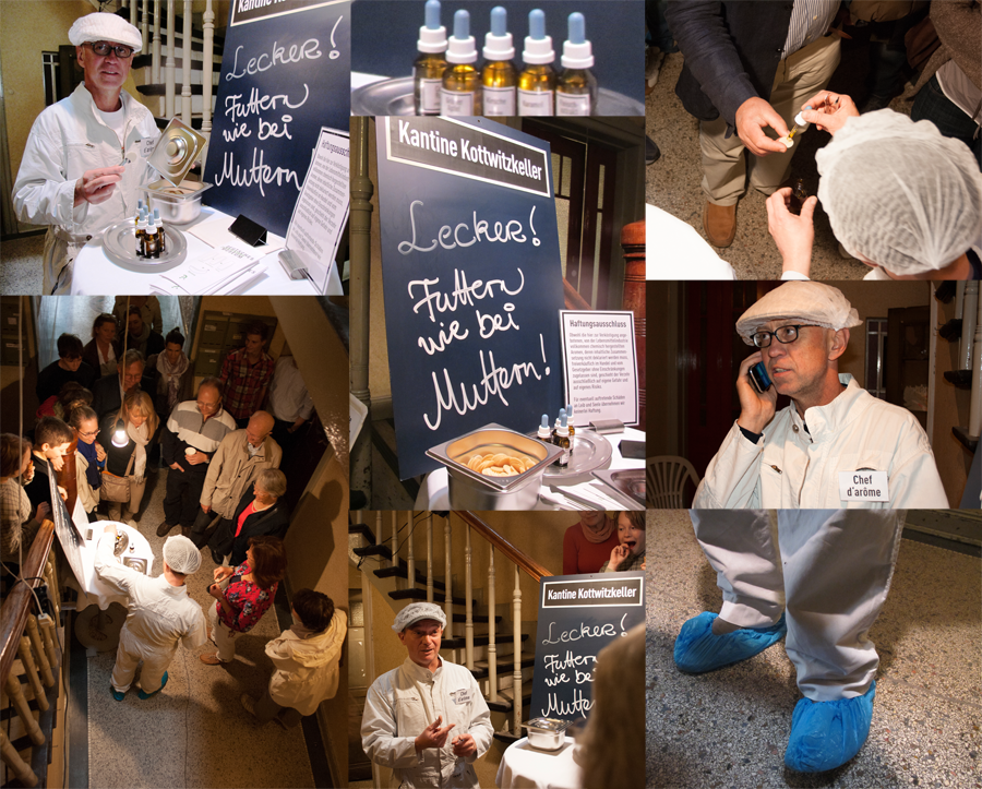 Verkostung mit Haftungsausschluss: „Obwohl diese von der Lebensmittelindustrie vollkommen chemisch hergestellten Aromen, deren Zusammensetzung nicht deklariert werden muss, freiverkäuflich im Handel und vom Gesetzgeber ohne Einschränkung zugelassen sind, geschieht der Verzehr auf eigene Gefahr und Risiko. Wir übernehmen keinerlei Haftung für eventuelle Schäden an Leib und Seele.” 1000 Hostien und 5 leckere künstliche Aromen. Treffendster (kindlicher) Kommentar zum Fleisch-Aroma: „Das riecht ja wie Hundefutter”. Stimmt.