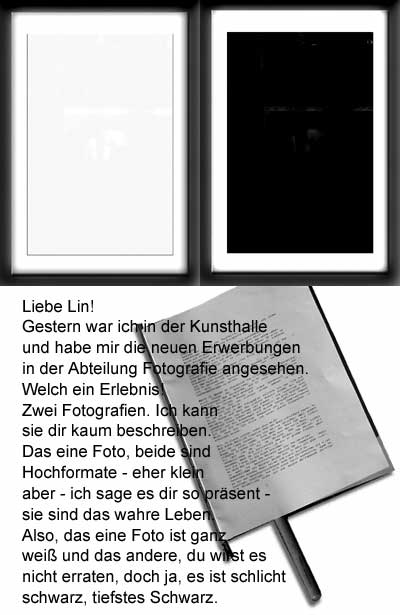 So ist es auch in der Fotografie: Belichte ich den Film mit einer Szene und dann das gleiche Negativ wieder mit einer weiteren Szene und wieder und wieder - ich vereinige also unendlich viele Szenen auf einem Negativ: es wird immer dichter und dichter und die Wiedergabe auf meinem fotografischen Papier ist dann ein vollendetes, kompaktes und so inhaltsschweres Weiß, dass mir die Sinne von allen diesen Eindrücken zu schwinden drohen.