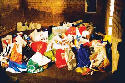 Rauminstallation; Holzrahmen, Spiegel, 53 Plastiktüten
