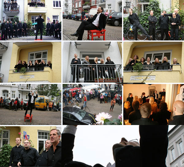 Barbara hat ihren Chor überzeugen können und der gab eine tolle Kostprobe auf Balkon, Fußweg und Straße ein Sonntags-Stuhlkonzert.